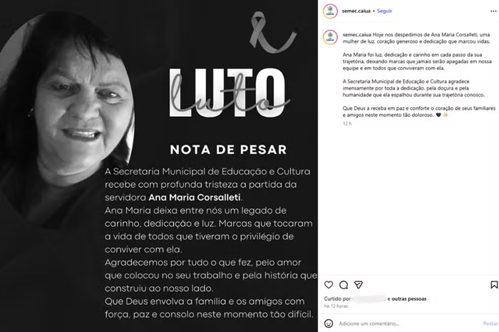 Ana Maria Corsalleti era funcionária pública na área da educação do município. Em nota divulgada nas redes sociais, a Secretaria Municipal de Educação e Cultura descreveu a servidora como “uma mulher de luz, coração generoso e dedicação que marcou vidas”. Seu corpo será velado a partir das 15h desta sexta- feira (14), na Casa de Velório de Caiuá.